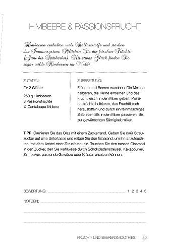 Einzelheiten: Es gibt nichts Wohltuenderes als einen gesunden und frisch zubereiteten Smoothie. Aus der ganzen Frucht hergestellt, ist das Multitalent der wohl leckerste Weg sich gesund und bewusst zu ernähren. 101 Smoothies bietet den besten Überblick über die fruchtig-cremigen Vitaminbomben, vom erfrischenden Fruchtsmoothie über den milden Joghurtsmoothie bis hin zum köstlichen Dessertsmoothie. Hier ist für jeden Geschmack das Richtige dabei! Wertvolle Tipps zu Küchengeräten und nützlichen Utensilien fehlen ebenso wenig wie ansprechende Servier- und Garnierungsvorschläge. Jedes Rezept wird außerdem von einem tollen Foto begleitet und auf den jeweiligen Seiten können Favoriten auf einer Skala von eins bis fünf bewertet und Anmerkungen notiert werden. Genießen Sie ein Glas des vielseitigen Getränks und begeben Sie sich auf eine einzigartige Reise in die Welt der 101 Smoothies!