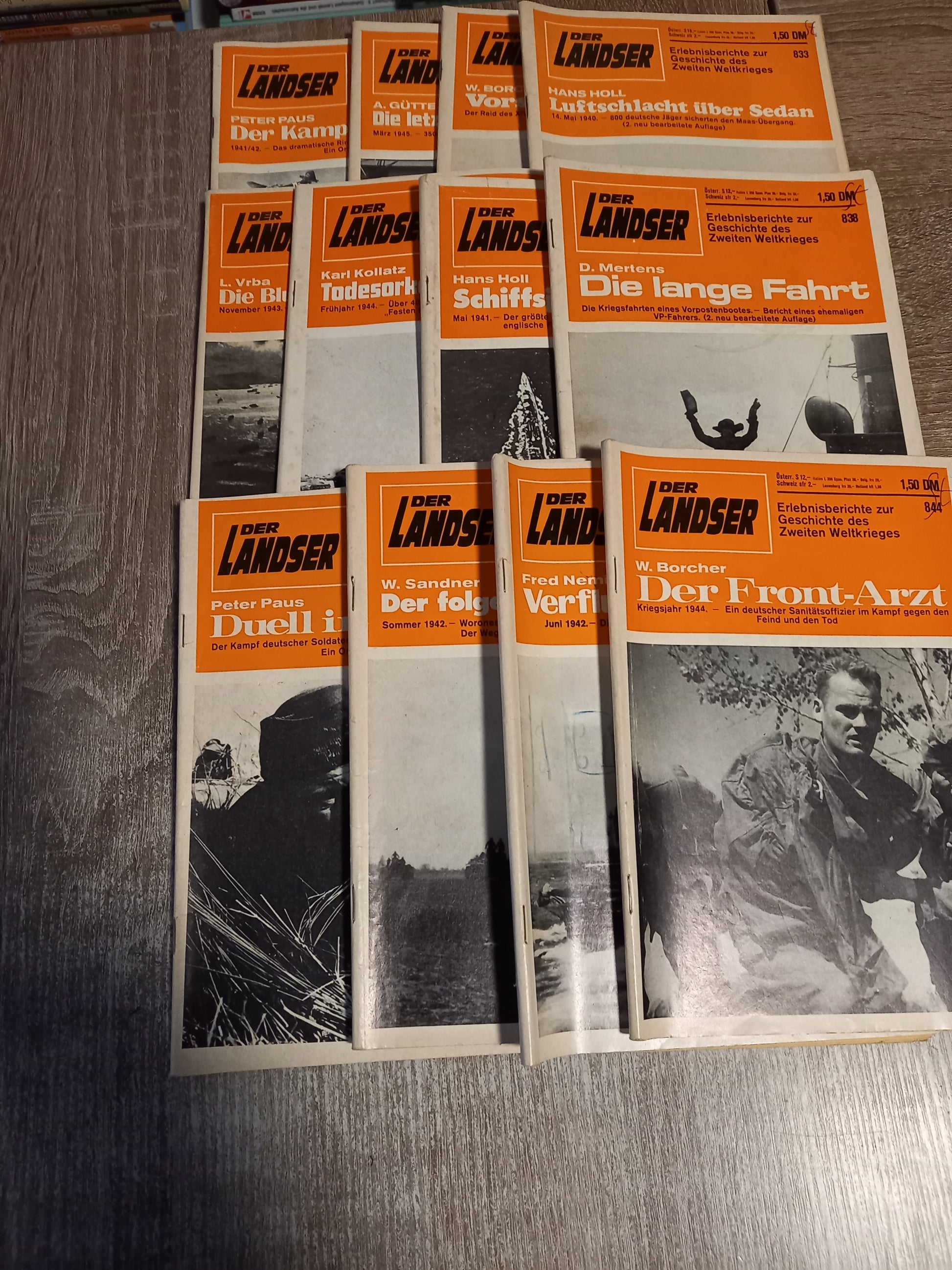 12 folgende Landser Hefte der orangenen Reihe 1) Der Kampf um Tobruk (830) 2) Die letzten Tage von Kolberg (831) 3) Vorstoß zur Wolga (832) 4) Lufschlacht über Sedan (833) 5) Die Blutmühle von Tarawa (834) 6) Todesorkan über Tarnopol (835) 7) Schiffsjagd vor kreta (837) 8) Die lange Fahrt (838) 9) Duell im Dunkel (839) 10) Der folgenschwere Sieg (840) 11) Verfluchter Pazifik (841) 12) Der Front Arzt (844) Minimale Gebrauchsspuren Minimal nachgedunkelt Auch A