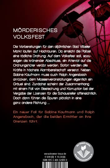 Einzelheiten: Ein neuer spannender Kriminalroman vom Bestseller-Autor Daniel Holbe um das Ermittlerteam Sabine Kaufmann und Ralph Angersbach Volksfest mit Todesfolge Mord auf dem Bad Vilbeler Markt . Die Vorbereitungen für das alljährliche Volksfest laufen auf Hochtouren. Da trifft bei der Polizei eine Nachricht mit einer Drohung ein: Auf dem Volksfest soll sozusagen als krönender Abschluss ein Attentat auf die Ordnungshüter verübt werden. Sofort werden alle Kräfte in höchste Alarmbereitschaft versetzt, das LKA wird angefordert, darunter Sabine Kaufmann, und zur Verstärkung muss auch Ralph Angersbach anrücken, dem solche Großveranstaltungen eigentlich ein Gräuel sind. Sabine und Ralph versuchen mit ihren Kollegen das Schreckliche zu verhindern. Zunächst scheint nahe zu liegen, dass die Drohung mit den Ermittlungen zusammenhängt, die gerade in Bad Vilbel durchgeführt werden und bei denen es um den Verdacht der Bestechung und Korruption bei der Vergabe der Lizenzen für die Schausteller geht. Doch dann führen die Spuren plötzlich in eine ganz andere Richtung … Der fünfte Fall in der Krimi-Reihe um das Team Sabine Kaufmann und Ralph Angersbach. Die vorigen Bände: Band 1: „Giftspur“ Band 2: „Schwarzer Mann“ Band 3: „Sühnekreuz“ Band 4: „Totengericht“.