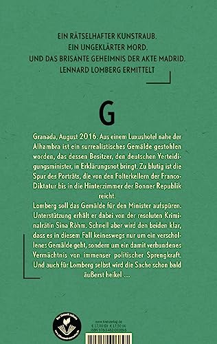 Einzelheiten: Die atemlose Jagd nach der bitteren Wahrheit eines gestohlenen Gemäldes, die von den Folterkellern der Franco-Diktatur bis in die Ministerien der Bonner Republik führt – ein neuer Fall für Lennard Lomberg voller politischer Intrigen und persönlicher Konflikte Von Francisco Franco, dem Caudillo de España, zu Franziskus Ritter, dem deutschen Verteidigungsminister: Lennard Lombergs Suche nach der bitteren Wahrheit eines geraubten Gemäldes führt ihn von Madrid nach Granada – und konfrontiert ihn auf dramatische Weise mit einem Versprechen, das er einst selbst gegeben und lange verdrängt hat. Granada im Sommer 2016. Bei einem Einbruch in ein Luxushotel nahe der Alhambra ist ein surrealistisches Gemälde gestohlen worden, das dessen Besitzer, den deutschen Verteidigungsminister, in große Erklärungsnot bringt. Zu blutig ist die Spur des Gemäldes, die von den Folterkellern der Franco-Diktatur bis in die Ministerien der Bonner Republik reicht. Von seinem Mentor Peter Barrington wird Lomberg beauftragt, das Gemälde für den Minister aufzuspüren. Unterstützung erhält er dabei von der resoluten Kriminalrätin Sina Röhm. Schnell aber wird den beiden klar, dass es hier keineswegs nur um den Diebstahl eines als verschollen geltenden Gemäldes geht, sondern um ein damit verbundenes Vermächtnis von immenser politischer Sprengkraft. Auch für Lomberg selbst ist die Sache heikel. Einerseits kreuzt das Gemälde nicht zum ersten Mal seinen Weg, andererseits muss er sich gleich zu Beginn der Ermittlungen die schmerzhafte Frage stellen, auf wessen Seite er eigentlich steht. Doch die Zeit drängt – schon bald wird aus der Suche nach dem Kunstwerk eine Hetzjagd und Lomberg vom Verfolger zum Verfolgten …