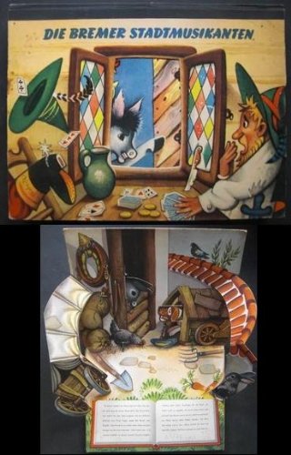 Die Bremer Stadtmusikanten. (Entwurf und Farbbilder von V. Kubasta / Kubarta) Gezeichnetes Bilderbuch mit aufklappbaren Figuren, ein sog. "Kulissenbilderbuch". Mit 8 "Pop Up" Szenen und einem (beweglichen) Schiebebild auf dem Einband vorne.