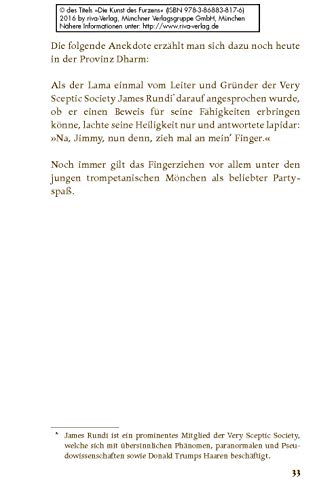 Einzelheiten: In diesem praktischen Leitfaden vertieft Seine Höchste Flatulenz der Darmei Lama erstmals die über Jahrtausende überlieferte hohe Kunst des Furzens weiter. Seine Eiligkeit eröffnet dem Leser den transzendenten Pfad zur ewigen Glückseligkeit durch Erleichterung: Traditionelle körperliche und geistige Ertüchtigungen führen den folgsamen Schüler zum glücklichen Dasein im Nirwinda. Diese Anleitung zur ganzheitlichen Lebenskunst enthält viele kluge philosophische und anthroposophische Ansätze für den praktischen Umgang mit unserem Darmsala und Bumsamsara.