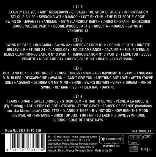 Einzelheiten: In 1934, Reinhardt and Parisian violinist Grappelli were invited to form the Quintette du Hot Club de France with Reinhardt s brother Joseph and Roger Chaput on guitar, and Louis Vola on bass. Occasionally Chaput was replaced by Reinhardt s best friend and fellow Gypsy Pierre Baro Ferret. The vocalist Freddy Taylor participated in a few songs, such as Georgia On My Mind and Nagasaki . Jean Sablon was the first singer to record with him more than 30 songs from 1933. They also used their guitars for percussive sounds, as they had no true percussion section. The Quintette du Hot Club de France was one of the few well-known jazz ensembles composed only of string instruments. In Paris on 14 March 1933 Reinhardt recorded two takes each of Parce que je vous aime and Si, j aime Suzy , vocal numbers with lots of guitar fills and guitar support, using three guitarists along with an accordion lead, violin, and bass. In August of the following year recordings were also made with more than one guitar (Joseph Reinhardt, Roger Chaput, and Django), including the first recording by the Quintette. In both years, it should be noted, the great majority of recordings featured a wide variety of horns, often in multiples, piano, etc. Reinhardt also played and recorded with many American jazz musicians such as Coleman Hawkins, Benny Carter, Rex Stewart (who later stayed in Paris), and a jam-session and radio performance with Louis Armstrong. Later in his career he played with Dizzy Gillespie in France. Reinhardt and the Hot Club of France used the Selmer Maccaferri, the first commercially available guitars with a cutaway and later with an aluminium-reinforced neck. When World War II broke out, the original quintet was on tour in the United Kingdom. Reinhardt returned to Paris at once, leaving his wife behind. Grappelli remained in the United Kingdom for the duration of the war. Reinhardt reformed the quintet, with Hubert Rostaing on clarinet replacing Grappelli s violin. In 1943, Reinhardt married Sophie Naguine Ziegler in Salbris, with whom he had a son, Babik Reinhardt, who became a respected guitarist in his own right
