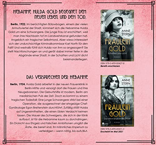 Einzelheiten: Band 2 der gefeierten Bestsellerreihe um die Hebamme Hulda Gold, die im Berlin der 1920er Jahre in rätselhafte Todesfälle verstrickt wird. 1923: Die Berliner Hebamme Hulda Gold wird zu einer Geburt ins Scheunenviertel nach Mitte gerufen. Obwohl die jüdische Familie dort nach ihren ganz eigenen, strengen Regeln lebt, gewinnt Hulda das Vertrauen der jungen Mutter. Als das Neugeborene nach wenigen Tagen verschwindet, macht sich Hulda auf die Suche nach ihm. Wie kann ein Kind in dieser engen Gemeinschaft einfach so verlorengehen? Je hartnäckiger Hulda den Spuren folgt, desto stärker stößt sie auf Widerstand, denn die Bewohner des Viertels haben ihre gut gehüteten Geheimnisse. Bald zeigt sich, dass die Berliner Polizei zur gleichen Zeit nach Kinderhändlern fahndet, und Hulda ahnt einen Zusammenhang. Kann Kommissar Karl North ihr helfen, das Neugeborene zu finden? Doch dann entlädt sich im Scheunenviertel der Judenhass in einem Pogrom, und Hulda selbst gerät in höchste Gefahr. Wo Glanz ist, ist auch Schatten: Hebamme Hulda Gold begegnet dem neuen Leben – und immer wieder auch dem Tod.