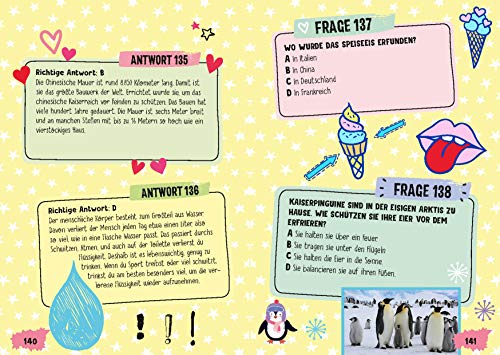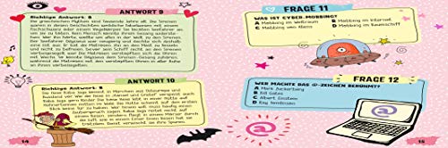 Einzelheiten: Witziger Quiz-Spaß für Mädchen! 150 spannende, verrückte und witzige Quizfragen aus allen Wissensgebieten Spielerischer Charakter durch Punktewertung und kniffliges Schlussrätsel Mit praktischer Frage- und Antwortseite Quizheldinnen aufgepasst! Hier kann man das eigene Wissen testen und erfahren, wie clever man wirklich ist. Von Geschichte, Sport und Tieren über Umwelt, Mode und Beauty bis hin zu lustigen Kuriositäten und vielem mehr - in diesem Quizbuch sind zahlreiche Fragen zu unterschiedlichen Themen versammelt: Wer führte als letztes europäisches Land das Frauenwahlrecht ein? Warum gibt es immer weniger Bienen? Oder wie alt war Beyoncé, als sie ihre erste Band, Destinys Child, gegründet hat? Diese und viele weitere Fragen warten darauf beantwortet zu werden. Von relativ einfach bis schwer ist jeder Schwierigkeitsgrad vertreten und das Allgemeinwissen wird auf die Probe gestellt. Das Punktesystem verleiht dem Quizzen einen spielerischen Charakter und die Antwortseiten ermöglichen zudem eine schnelle und einfache Selbstkontrolle. Das Quizbuch kann man allein, mit der Familie oder seinen Freunden lösen. Ein Muss für alle cleveren Mädchen ab 8 Jahren!