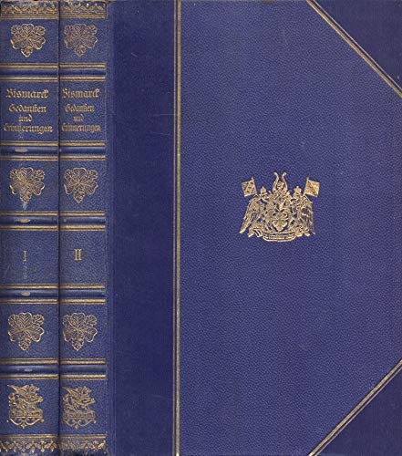 Einzelheiten: Gedanken und Erinnerungen von Otto Fürst von Bismarck. Erster und zweiter Band 1898 (siehe unser Foto). Verlag der J. G. Cotta'schen Buchhandlung, Stuttgart 1898. Fraktur-Schrift. Bd. I: XVI + 376 Seiten mit einem Frontispiz im Vorsatz / Bd. II: XVI + 312 Seiten plus einer großen, doppelseitigen Faksimile-Faltseite im Anhang. Gebundene Ausgaben mit marmorierten und etwas nachgedunkeltem Buchschnitt in goldgeprägten Leineneinbänden. Format: 24 x 16 cm. 1,9 Kg