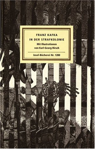 Einzelheiten: Die Exekution in der Strafkolonie dauert zwölf Stunden. Ohne Urteil und ohne Verteidigungsmöglichkeit wird der Delinquent bäuchlings in eine Maschinerie eingespannt, die ihm das übertretene Gebot mit Eisennadeln in den Körper einschneidet, bis er verblutet ist. Dann gibt die Maschine den leblosen Körper des Hingerichteten frei. Karl-Georg Hirsch hat die agierenden Personen in Kafkas Erzählung ins Bild gesetzt.