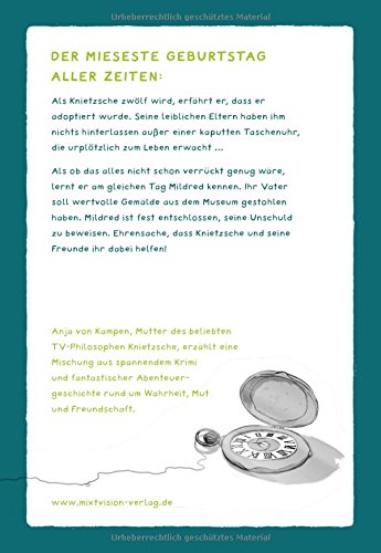 Einzelheiten: Pressestimmen Ein Buch, das Eltern gerne kaufen – und das Kinder tatsächlich auch lesen wollen. -- Uli Morant ... eine Mischung aus spannendem Krimi und fantastischer Abenteuergeschichte ... -- Fabian Wölfling ― Mitteldeutsche Zeitung Die Geschichte ist spannend, gut erzählt und handelt davon, dass man zusammen mehr schafft als allein. -- Luis (12) ― Dein Spiegel ... spannend, witzig, originell … Das schreibt nach Fortsetzung(en). ― Kinder- & Jugendbuch Special des Börsenblatts Kurzbeschreibung Knietzsche erlebt den miesesten Geburtstag aller Zeiten: Als er zwölf wird erfährt er, dass er adoptiert wurde. Seine leiblichen Eltern haben ihm nichts hinterlassen außer eine kaputte Taschenuhr, die urplötzlich zum Leben erwacht ... Als ob das alles nicht schon verrückt genug wäre, lernt er am gleichen Tag Mildred kennen: Ihr Vater sitzt in Untersuchungshaft, weil er wertvolle Gemälde aus dem Museum gestohlen haben soll. Mildred ist fest entschlossen, seine Unschuld zu beweisen. Ehrensache, dass Knietzsche und seine Freunde Norbert, Pepe und Darwina ihr dabei helfen! Knietzsche, bekannt aus Ki.KA und ARD, erobert die Welt der Bücher: In „Knietzsche und das Hosentaschen-Orakel“ erlebt er ein spannendes Abenteuer mit seinen Freunden Mildred, Norbert, Pepe und Darwina. In dem spannenden Krimi geht es um Wahrheit, Mut und große Rätsel. Aber was am wichtigsten ist: Freunde zu haben, die immer zusammenhalten! Quiz ab Klasse 6 bei Antolin abrufbar Über den Autor und weitere Mitwirkende Anja von Kampen, geboren in Konstanz, ist Film- und Fernsehproduzentin in Berlin, Regisseurin, Weltreisende, Erfinderin und Autorin. Am liebsten arbeitet sie für Kinder, weil in ihren Köpfen noch alles möglich ist. Für das deutsche Kinderfernsehen hat sie 2012 die preisgekrönte Animationsfigur Knietzsche erfunden. Er darf sich über die großen Themen des Lebens wie Angst oder den Tod witzig-schräge Gedanken machen und wurde inzwischen von zahlreichen Sendern im Ausland übernommen. Kilian Schütz wurde 1988 in einer kleinen Stadt geboren und studierte dann Audiovisuelle Medien mit Schwerpunkt Film und Animation in einer größeren Stadt. Heute lebt er in der größten Stadt Deutschlands und illustriert, photographiert, schreibt und storyboardet für Buch, Film und Fernsehen. Hauptsächlich wird er dafür bezahlt kleine Kinder mit großen Köpfen zu malen. All das mag seltsam klingen, scheint aber gesellschaftlich akzeptiert.