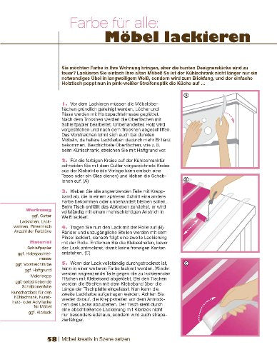 Einzelheiten: Setzen Sie Ihre eigenen Wohn-Trends! Schöner einrichten und wohnen – mit diesem Buch gestalten Sie Ihre 4 Wände neu und originell. Dieses Buch ist Ideenlieferant und Nachbauvorlage in einem und bietet Ihnen über 60 Kreativprojekte rund um die Themen Wände, Möbel, Licht, Textilien und Kinderzimmer. Jedes Projekt wird mit einer ausführlichen Schritt-für-Schritt-Anleitung, mit Illustrationen zu den einzelnen Arbeitsschritten und Variationsideen vorgestellt. Special-Seiten vermitteln Grundlagentechiken, Werkzeugkunde und Basis-Knowhow zu Materialien, Farben und vielem mehr. - über 60 Kreativprojekte rund um das Thema Einrichten und Wohnen - mit leicht verständlichen Schritt-für-Schritt-Anleitungen, Illustrationen zu wichtigen Arbeitsschritten sowie Angaben zu erforderlichen Werkzeugen und Materialien - Vorstellung aller wichtigen Grundtechniken wie Streichen, Tapezieren, Schablonieren, Holzbearbeitung, Nähen u. v. m.