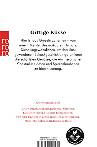Einzelheiten: Giftige Küsse Hier ist das Gruseln zu lernen – von einem Meister des makabren Humors. Diese ungewöhnlichen, weltberühmt gewordenen Schockgeschichten garantieren die schärfsten Genüsse, die ein literarischer Cocktail mit Arsen und Spitzenhäubchen zu bieten vermag. www.roalddahl.com 10% der Autorentantieme aus dem Verkauf dieses Buches kommen dem Roald-Dahl-Wohltätigkeitsverein zugute. Informationen dazu siehe innen.