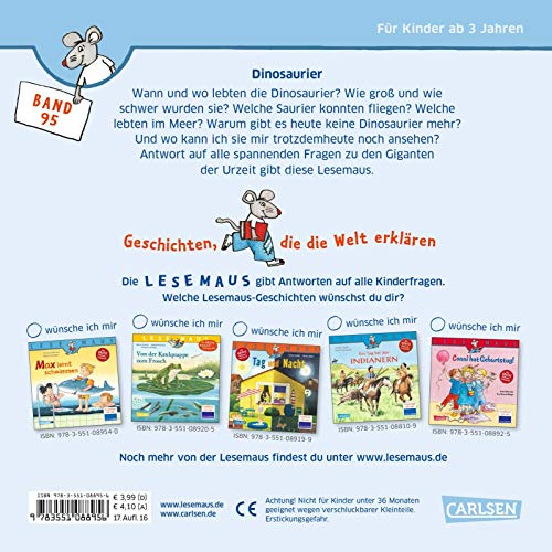 Einzelheiten: *** Alles über Dinos - erstes Wissen für Kinder ab 3 Jahren *** Wann und wo lebten die Dinosaurier? Wie groß und wie schwer wurden sie? Welche Saurier konnten fliegen? Welche lebten im Meer? Warum gibt es heute keine Dinosaurier mehr? Und wo kann ich sie mir trotzdem heute noch ansehen? Antworten auf alle spannenden Fragen zu den Giganten der Urzeit gibt diese Lesemaus-Geschichte. *** LESEMAUS – Geschichten, die die Welt erklären! *** Die Bilderbücher für Kinder ab 3 Jahren sind ideal zum gemeinsamen Anschauen und Vorlesen. Verständliche Texte und hochwertige Illustrationen vermitteln erstes Sachwissen zu wichtigen Themen aus dem Kinderalltag. Empfohlen von der Stiftung Lesen.