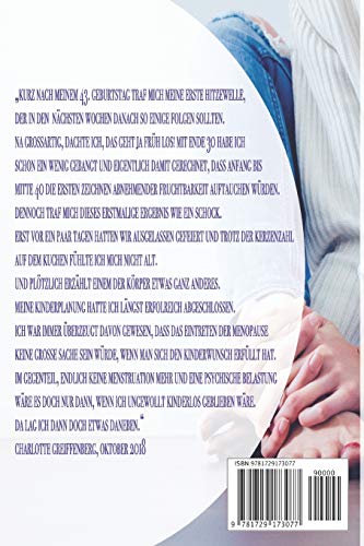 Einzelheiten: ★★★ Noch kurze Zeit für 8,99 € statt 12,99 € - Sie sparen über 30% im Vergleich zum regulären Preis ★★★ Sind Sie manchmal verwirrt, weil Ihnen ihre Gefühle mal wieder ein Schnippchen schlagen? Aufgeregt sein wie ein Teenie kommt Ihnen auch irgendwie wieder bekannt vor? Leiden Sie unter Hitzewallungen und wissen nicht, was Sie dagegen tun können? So ging es auch Charlotte Greiffenberg. In Ihrem Buch schreibt sie ganz offen und ehrlich, wie sie die turbulente Zeit gemeistert hat. „Kurz nach meinem 43. Geburtstag traf mich meine erste Hitzewelle, der in den Wochen danach so einige folgen sollten. Na großartig, dachte ich, das geht ja früh los! Mit Ende 30 habe ich schon ein wenig gebangt und eigentlich damit gerechnet, dass Anfang bis Mitte 40 die ersten Zeichen abnehmender Fruchtbarkeit auftauchen würden. Dennoch traf mich dieses erstmalige Erlebnis wie ein Schock. Erst vor ein paar Tagen hatten wir ausgelassen gefeiert und trotz der Kerzenanzahl auf dem Kuchen fühlte ich mich nicht alt. Und plötzlich erzählt einem der eigene Körper etwas ganz anderes. Meine Kinderplanung hatte ich längst erfolgreich abgeschlossen. Ich war immer überzeugt davon gewesen, dass das Eintreten der Menopause keine große Sache sein würde, wenn man sich den Kinderwunsch erfüllt hat. Im Gegenteil, endlich keine Menstruation mehr und eine psychische Belastung wäre es doch nur dann, wenn ich ungewollt kinderlos geblieben wäre. Da lag ich dann doch etwas daneben.“ Charlotte Greiffenberg, Oktober 2018★★★ INKLUSIVE UMFANGREICHES BONUSMATERIAL ★★★Die Autorin Charlotte Greiffenberg erläutern in ihrem Buch auf knapp 200 Seiten unter anderem:★ Was die Wechseljahre überhaupt sind★ Welche Erfahrungen sie in der turbulenten Zeit gemacht hat★ Wie auch Sie diese Zeit gut meistern können★ Wie Tipps, Tricks und Anregungen schnell und einfach umsetzbar sind★ Was es heißt sich bewusst und zielgerichtet zu ernähren ★ Wie Sie so ihren Hormonhaushalt in den Griff bekommen könnenSie erhalten geballtes und fundiertes Wissen über:★ Prägnante und fundierte Informationen zur Menopause★ Erfahrungsberichte ★ Tipps & Tricks ★ Informationen zum Thema Glücksnahrung und wie Sie ihren Hormonhaushalt positiv beeinflussen kann★ 33 Rezepte zum Nachmachen ★ Ein Tagebuch um das Erlernte direkt umsetzen zu könnenDamit das Erlernte in die Praxis umgesetzt werden kann, stellt die Autorin Ihnen ein Tagebuch zur Verfügung.Alleine das Tagebuch kostet normalerweise einzeln mehr als eine Taschenbuchausgabe dieses Buches.„Mir ist es wichtig, dass der Leser einen Mehrwert hat für den er eben nicht weiteres Geld oder seine Daten wie seine E-Mail-Adresse investieren muss. Das Erlernte soll umgehend in die Praxis umgesetzt werden können. Ich empfehle Ihnen die Taschenbuchausgabe, da Sie hier das Tagebuch führen können und direkten Zugriff auf die wichtigen Informationen des Buches haben. Wer die Ebook-Ausgabe erwirbt kann sich die Tagebücher zusätzlich kostenlos downloaden und ausdrucken.“ ★★★ DER ALLROUND RATGEBER FÜR MEHR INNERE BALANCE IN DEN WECHSELJAHREN! GREIFEN SIE JETZT ZU UND BESTELLEN SIE MIT 1-CLICK★★★