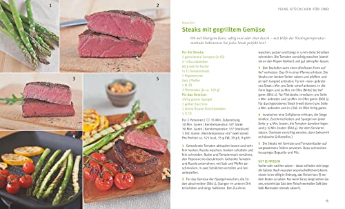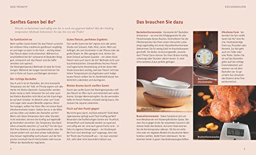 Einzelheiten: Wunderbar zarte Fleischgerichte mit Gelinggarantie sind kein Geheimnis mehr. Nach dem Bestseller Zart und saftig bei 80° legt Erfolgsautorin Margit Proebst nach. Über 30 köstliche Fleischgerichte und dieses Mal sogar auch Fisch, die ganz einfach und auf den Punkt gelingen. Niedrigtemperaturgaren ist der Schlüssel zum Küchenerfolg! Ganz sanft und schonend garen die guten Stücke wie von alleine im Ofen, während man sich schon um seine Gäste kümmern kann. Rezepte für 2, 4 oder auch 8 Personen garantieren Genuss im kleinen und großen Kreis. Wie wäre z. B. ein Dinner for two mit Entenbrust in Cranberry-Portwein-Sauce, Seeteufel mit Orangen-Mandel-Sauce als Familienessen oder ein saftiges Chateaubriand beim großen Dinner. Kompliziert ist nur die Entscheidung für das passende Rezept - sicher dagegen der Erfolg bei ihren Gästen! Für perfektes Gelingen gibt es zusätzlich die Garzeitentabelle und für den perfekten Rundumgenuss Zusatzrezepte für leckere Saucen.