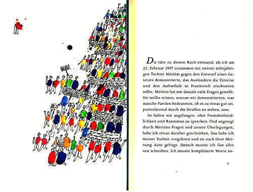 Einzelheiten: «Papa, was ist ein Fremder? Wieso haben manche Menschen schwarze Haut und andere Menschen weiße Haut? Sind Ausländer anders als wir? Ist Rassismus normal? Könnte auch ich zu einer Rassistin werden? Was können wir denn tun, damit die Menschen einander nicht hassen, sondern gern haben?» Diese und andere schwierige Fragen stellt die zehnjährige Mérièm ihrem Vater, dem berühmten französisch-maghrebinischen Schriftsteller Tahar Ben Jelloun. Und der Vater erklärt der Tochter in einem einfachen und anschaulichen Gespräch, wie Fremdenfeindlichkeit und Rassismus entstehen und welche Folgen sie haben: wie Vorurteile in Diskriminierungen münden können; wann Rassismus und Kolonialismus zu Sklaverei und Völkermord geführt haben; aber auch, daß niemand als Rassist geboren, sondern erst durch die Verhältnisse dazu gemacht wird.