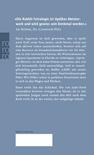 Einzelheiten: Pressestimmen «Rabbit» ist ein großer Wurf. ― Die Zeit Kurzbeschreibung «Die Rabbitt-Tetralogie ist Updikes Meisterwerk und wird gewiss sein Denkmal werden.» (Ian McEwan, Die literarische Welt) Harry Angstrom ist dick geworden, aber er spielt noch Golf, seine Frau Janice, nicht bereit, schon aus dem aktiven Leben auszuscheiden, bereitet sich auf eine Karriere als Grundstücksmaklerin vor. Sie können es sich inzwischen leisten, die Wintermonate im eigenen Apartment in Florida zu verbringen. ‹Springer Motors› ist dem Sohn Nelson anvertraut, der, wie sich herausstellt, Geld unterschlägt, weil er rauschgiftsüchtig geworden ist. Rabbit schläft mit seiner Schwiegertochter, was zu einer Familienkatastrophe führt. Wie früher schon in prekären Situationen setzt er sich in den Wagen und flüchtet. Dann ereilt ihn das Schicksal. Die von Junk-Food verstopften Arterien versagen den Dienst, als er mit spielenden Jungen noch einmal den Ball nach dem Korb wirft: Es ist der zweite, der endgültige Infarkt. Über den Autor und weitere Mitwirkende Geboren am 18.03.1932 in der Kleinstadt Shillington, Pennsylvania, als einziges Kind des Sekundarschullehrers und Diakon Wesley Russel Updike und dessen Frau Linda Grace Hoyer. Kindheit in materieller Bedrücktheit. Schulbesuch weiterhin in Shillington. 1950 Stipendium zum Studium am Harvard College, Hauptfach Anglistik; Abschluss des Untergraduiertenstudiums 1954 mit summa cum laude. Er heiratete 1953 die Kunststudentin Mary Entwistle Pennington, mit der er nach Abschluss des Studiums ein Jahr an die Ruskin School of Drawing and Fine Art in Oxford, England, ging. Nach Rückkehr in die USA von 1955-1957 fest angestellt beim Magazin «The New Yorker». Danach verfasste er als freier Mitarbeiter Kurzgeschichten und einflussreiche literarische Kritiken. 1957 Umzug nach Ipswich im neuenglischen Massachusetts. 1964 Vortragsreisen durch die UdSSR, Rumänien, Bulgarien und die Tschechoslowakei. Seit 1964 war Updike Mitglied des National Institute of Arts and Letters. 1973 Fulbright-Lektor in Afrika. 1976 Mitglied der American Academy of Arts and Letters. Auszeichnungen: Guggenheim Fellowship in Poetry für «The Carpendered Hen and Other Tame Creatures» (1959); Rosenthal Foundation Award des National Institute of Arts and Letters für «Das Fest am Abend» (1960); Pulitzer Price for Fiction für «Bessere Verhältnisse» (1982); Lincoln Literary Award (1983); Distinguished Pennsylvania Artist Award (1983); National Book Critics Circle Award for Criticism für «Amerikaner und andere Menschen» (1984); St. Louis Literary Award (1988); Bobst Award for Fiction (1988); National Medal of Arts (1989); Premio Scanno (1991); O'Henry Award für «A Sandstone Farmhouse» aus «The Afterlife and Other Stories» (1991); Common Wealth Award (1993); Conch Republic Prize for Literature (1993) Commandeur de l'ordre des arts et des lettres (1995); The Howells Medal from the Academy of Arts and Letters (1995). John Updike starb am 27. Januar 2009 in Massachusetts. Sein gesamtes Werk ist auf Deutsch im Rowohlt Verlag und im Rowohlt Taschenbuch Verlag erschienen. Maria Carlsson ist seit Ende der Fünfzigerjahre als Übersetzerin angloamerikanischer belletristischer Werke tätig. Sie ist vor allem mit den Übertragungen der Romane und Erzählungen John Updikes hervorgetreten. 1994 wurde sie mit dem Heinrich Maria Ledig-Rowohlt-Preis und 2oo2 mit dem Helmut-M. Braem-Übersetzerpreis ausgezeichnet.