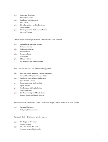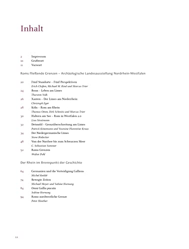 Einzelheiten: Der Niedergermanische Limes: Leben an und mit der nassen Grenze am Rhein Mehr als 400 Jahre trennte der Niedergermanische Limes die römische Provinz Niedergermanien vom germanischen Siedlungsgebiet. Er begann in Bad Breisig und endete bei Katwijk an der Nordsee. Doch er war kein römischer Grenzwall, sondern eine rund 400 km lange Flussgrenze. War dieser Teil des Limes eine Grenze nach unserem heutigen Verständnis? Gab es ein friedliches Miteinander mit Handel und Austausch oder eher ein Gegeneinander mit vielen kriegerischen Konflikten? Pflegte die Bevölkerung links des Rheins nur die römische Lebensweise und die rechts des Rheins nur die germanische? Wie lebten die Menschen in den Römerkastellen und Städten am Limes, wie auf dem Land? Auf all diese Fragen und viele mehr gibt der Begleitband zur Archäologischen Landesausstellung Nordrhein-Westfalen Antworten. In 86 reich bebilderten Beiträgen bündelt er die aktuellen archäologischen Erkenntnisse, die fünf unterschiedliche Ausstellungen zu »Roms fließenden Grenzen« an fünf Museums-Standorten – Bonn, Xanten, Köln, Haltern am See und Detmold – beleuchten. Das römische Rheinland – Vom Werden der Provinz Niedergermanien Roms Adler am Rhein – Der Niedergermanische Limes als nordwestliche Grenze des römischen Imperiums Mediterrane Lebensart – Die römischen Städte Köln und Xanten Vici, Villen, Wohnstallhäuser – Leben auf dem Lande Leben mit Rom – Römischer Einfluss und germanische Tradition in der Germania magna Mit spannenden Berichten über spektakuläre Neufunde und detaillierten Abbildungen originalgetreuer Nachbauten lässt dieser Begleitband die Zeit der Römer in Nordrhein-Westfalen wieder lebendig werden! Roms fließende Grenzen. Archäologische Landesausstellung Nordrhein-Westfalen in folgenden Museen: 24. September 2021 – 27. Februar 2022 Lippisches Landesmuseum Detmold: Grenzüberschreitung am Limes 30. September 2021 – 16. Oktober 2022 LVR-Archäologische Park Xanten / LVR-RömerMuseum: Der Limes am Niederrhein 25. November 2021 – 29. Mai 2022 LVR-LandesMuseum Bonn: Leben am Limes 25. März 2022 – 30. Oktober 2022 LWL-Römermuseum Haltern am See: Rom in Westfalen 2.0 29. April 2022 – 9. Oktober 2022 Kulturzentrum am Neumarkt Köln: Rom am Rhein