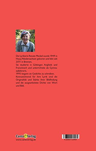 Einzelheiten: Die Lyrikerin Renate Meckel wurde 1949 in Hoya/ Niedersachsen geboren und starb 2015 in Bremen. Sie studierte in Göttingen Anglistik und Französisch und unterrichtete als Gymnasiallehrerin. 1995 begann sie Gedichte zu schreiben. Kennzeichnend für ihre Lyrik ist die Originalität und Stärke ihrer Bildfindung und die ausgearbeitete Dichte von Wort und Bild. Das Buch ist die erste Veröffentlichung des Großteils der Gedichte dieser zurückgezogenen Künstlerin. „Ihre Gedichte gehören zu den spannendsten, tiefgründigsten und wortgewaltigsten, die ich jemals lesen und hören durfte. Zeitgleich mit ihrem Tod erschien ein Gedichtband mit mehr als 300 Gedichten von ihr.“ Anke Fischer (Autorin und Dozentin für kreatives Schreiben) Schwarzer Samt mein Morgen um meine schwankende Gestalt blüht weißer Schleier des Vergessens barfuß tanze ich auf dem glänzenden Fell einer Ziege Renate Meckel