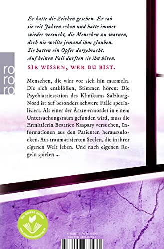 Einzelheiten: Er hatte die Zeichen gesehen. Er sah sie seit Jahren schon und hatte immer wieder versucht, die Menschen zu warnen, doch nie wollte jemand ihm glauben. Sie hatten ein Opfer dargebracht. Auf keinen Fall durften sie ihn hören. SIE WISSEN, WER DU BIST. Menschen, die wirr vor sich hin murmeln. Die sich entblößen, Stimmen hören: Die Psychiatriestation des Klinikums Salzburg-Nord ist auf besonders schwere Fälle spezialisiert. Als einer der Ärzte ermordet in einem Untersuchungsraum gefunden wird, muss die Ermittlerin Beatrice Kaspary versuchen, Informationen aus den Patienten herauszulocken. Aus traumatisierten Seelen, die in ihrer eigenen Welt leben. Und nach eigenen Regeln spielen ... Der dritte Fall des Ermittlerduos Kaspary & Wenninger